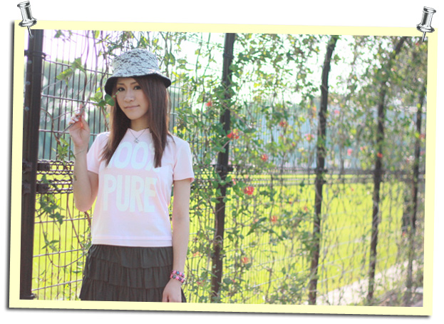うすピンクのTシャツにカーキ色のティアードスカートの組み合わせは