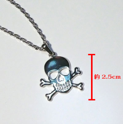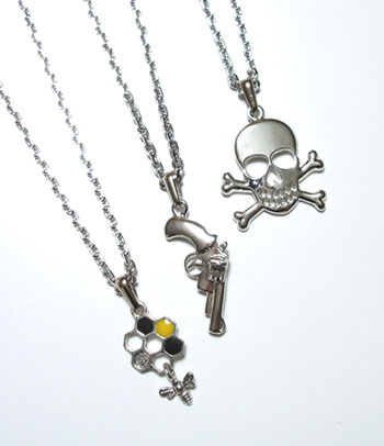 インパクト大のドクロ、ピストルとかわいいみつばちのネックレス。