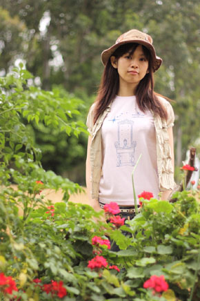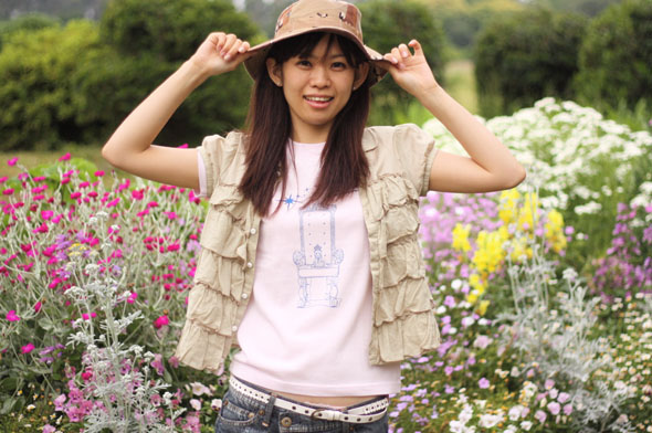 メルヘンチックなピンクの「ネコの王様」Tシャツはデニムスカートやサファリハットと合わせて